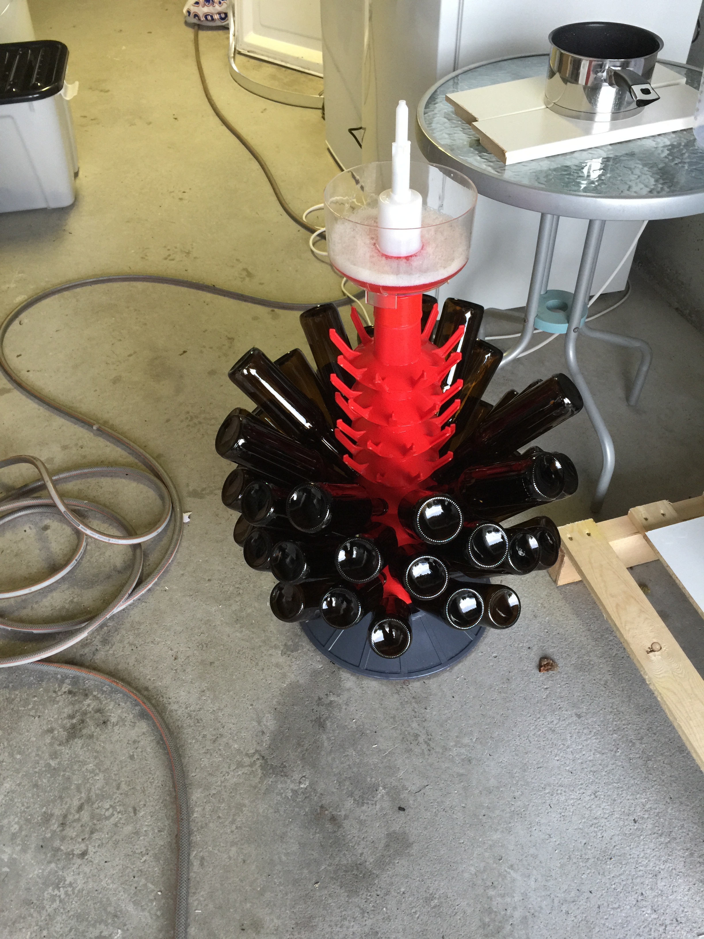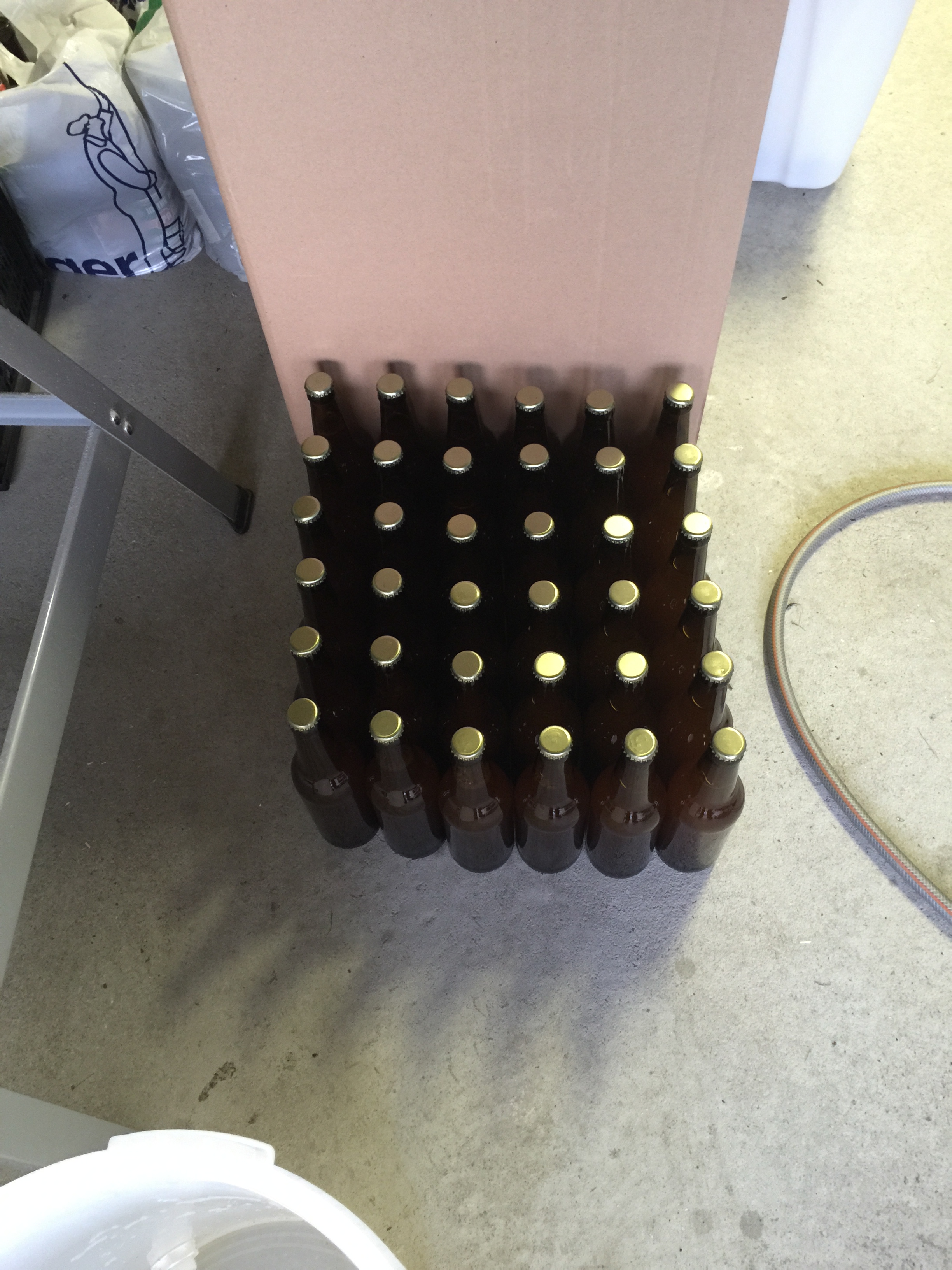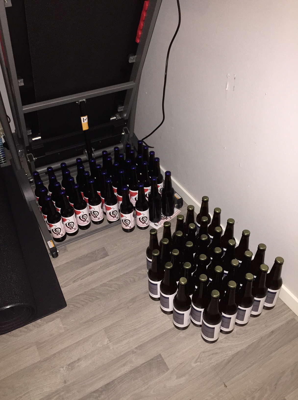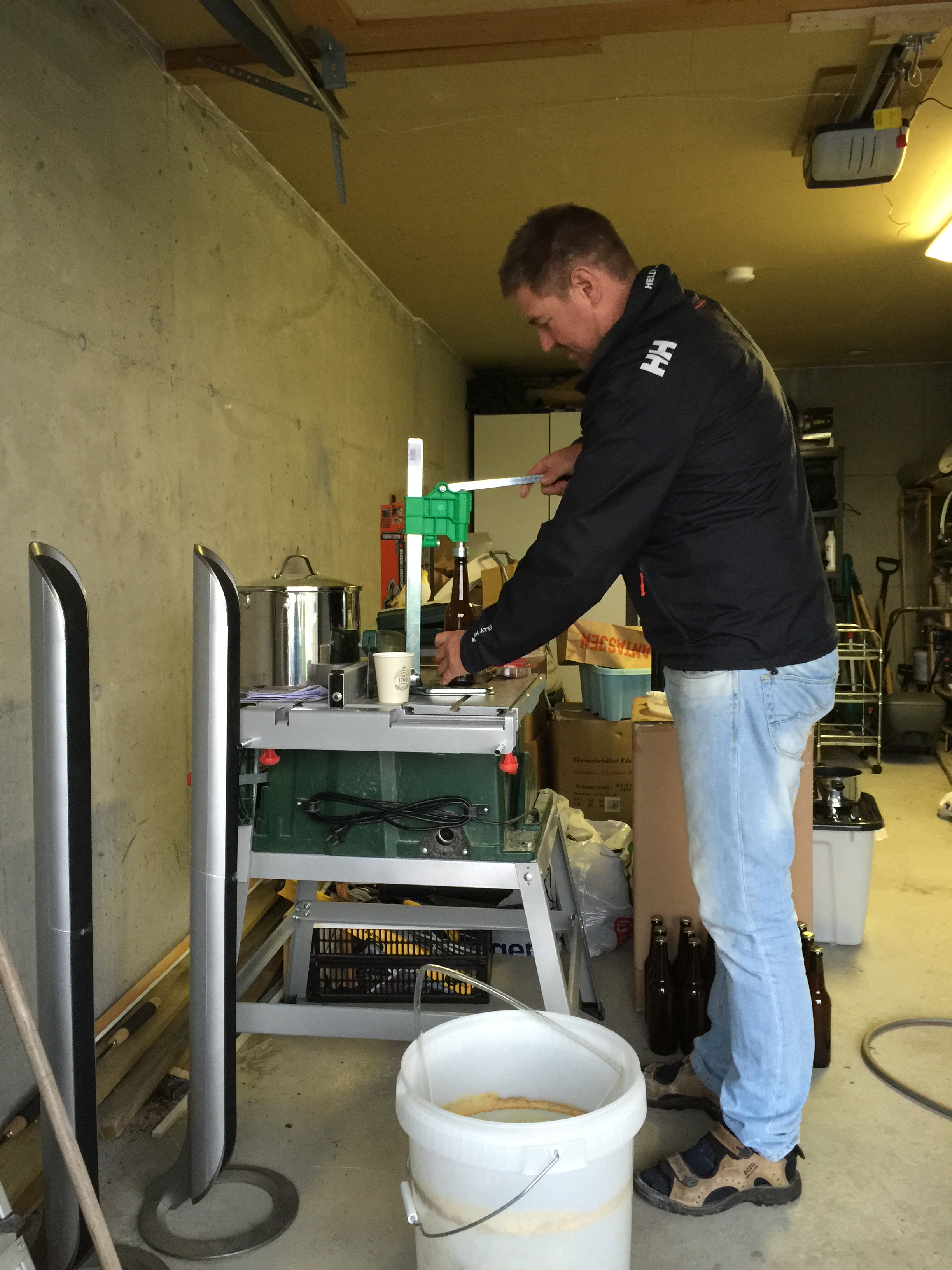 For den observante lesar kan ein skimte litt av flasketreet på biletet. Eit vellukka resultat avhenger av god hygiene gjennom heile prosessen. Alle flasker og korkar blir skylde i StarSan før ein tappar ølet på flaske.