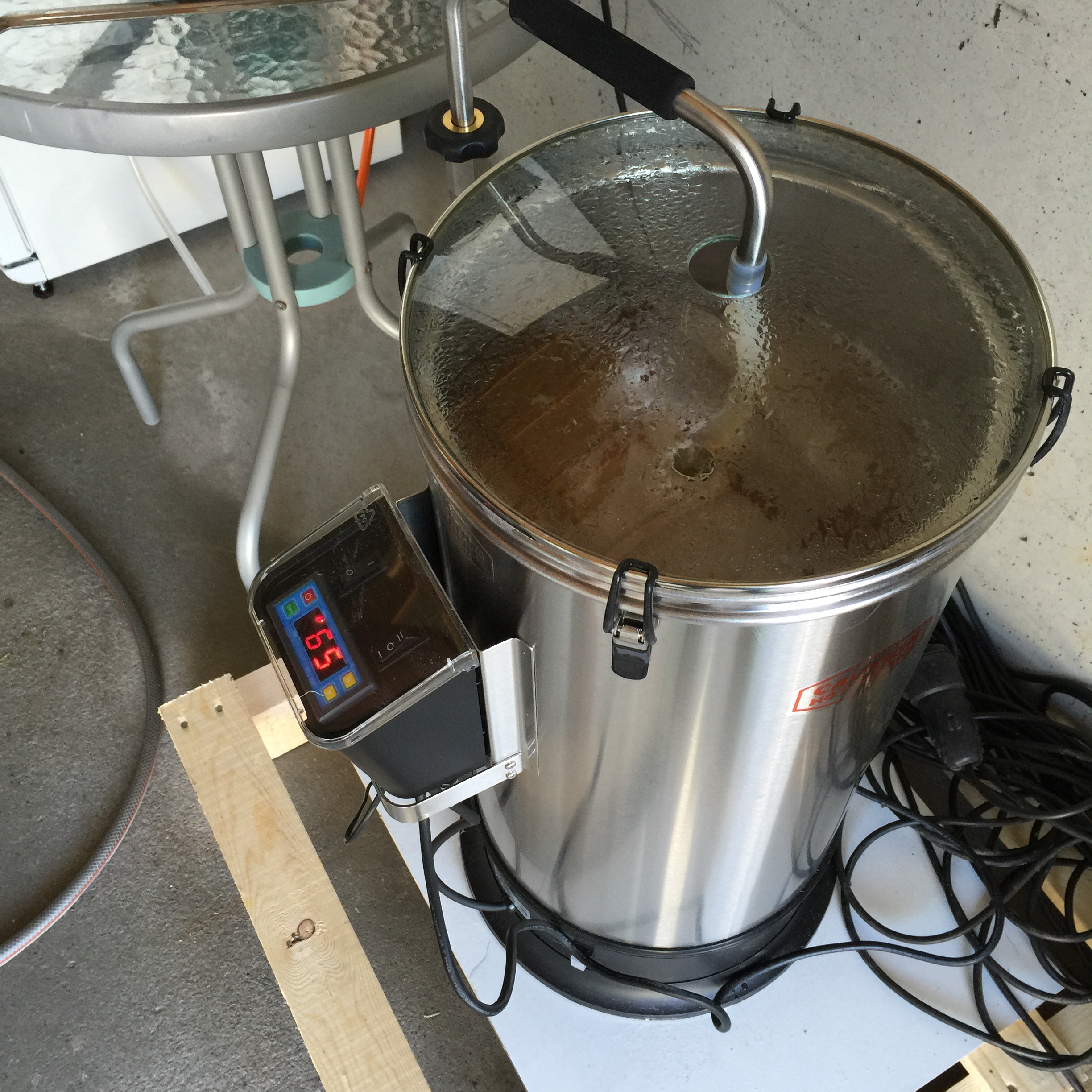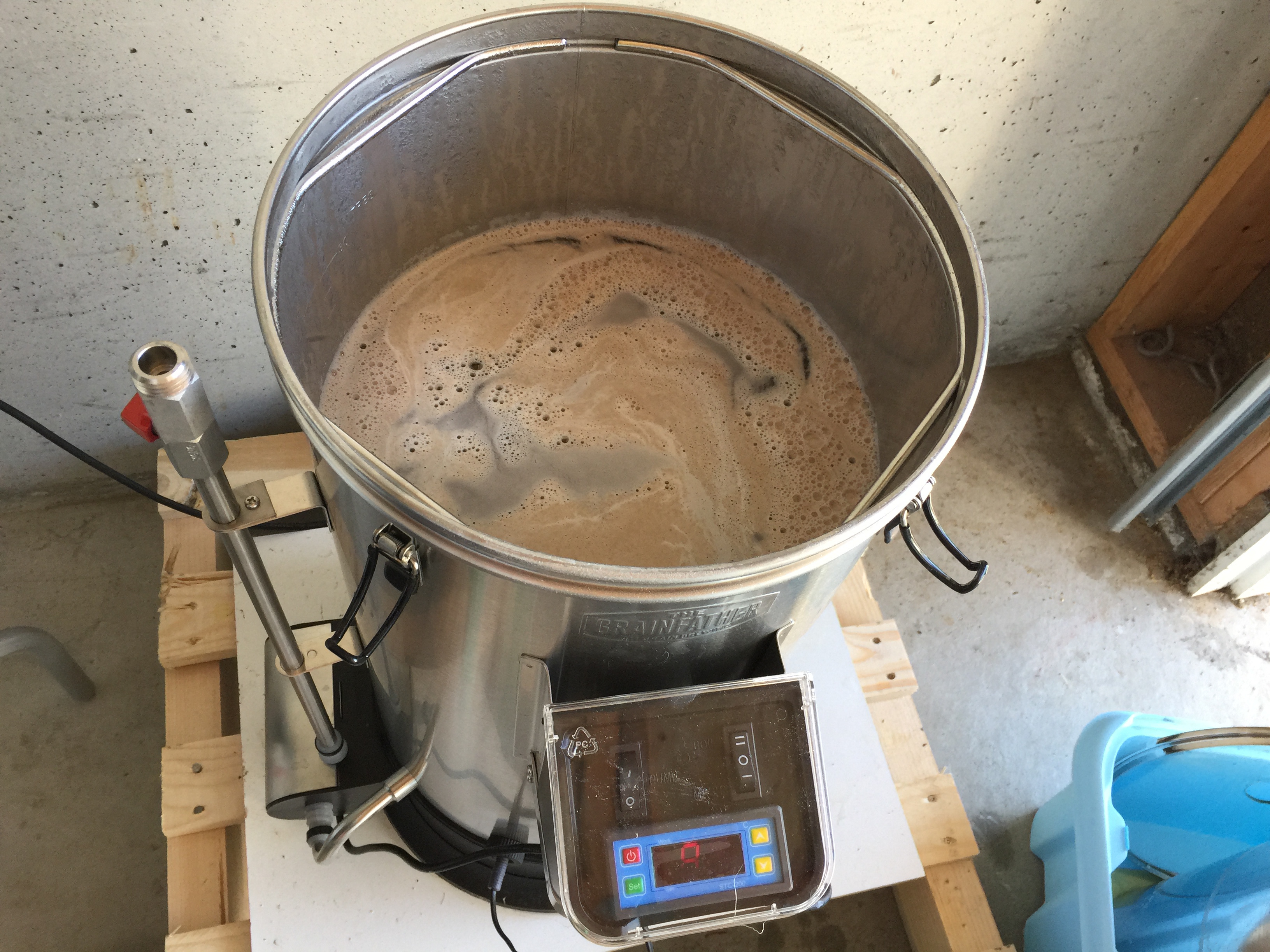 Sidan tolmod ikkje alltid er mi sterke side, så sette eg i gang så rask som mogeleg etter eg hadde alt på plass. Grainfatheren blei montert og testa med vatn laurdag. Søndag var eg i gong, og med litt verktøy lånt frå naboen blei skruane på maltmølla stramma slik at målinga kunne starte. Med montering av diverse undervegs blei det ikkje tid til å sjå opp igjen instruksjonsvideoen frå Grainfather. Difor fekk eg ikkje med meg at det var viktig å røyre godt når kornet gjekk inn, samt at rista på topp skulle trykkast ned før skyljing. At ein må bruke Grainfather kalkulatoren for å berekne vassmengda gjekk meg og hus forbi. Resultatet blei ein OG på 1.055, som er eit godt stykke under forventa OG.